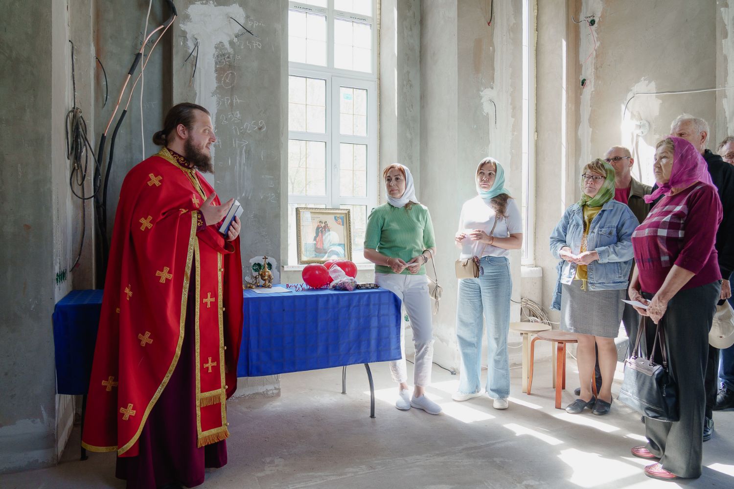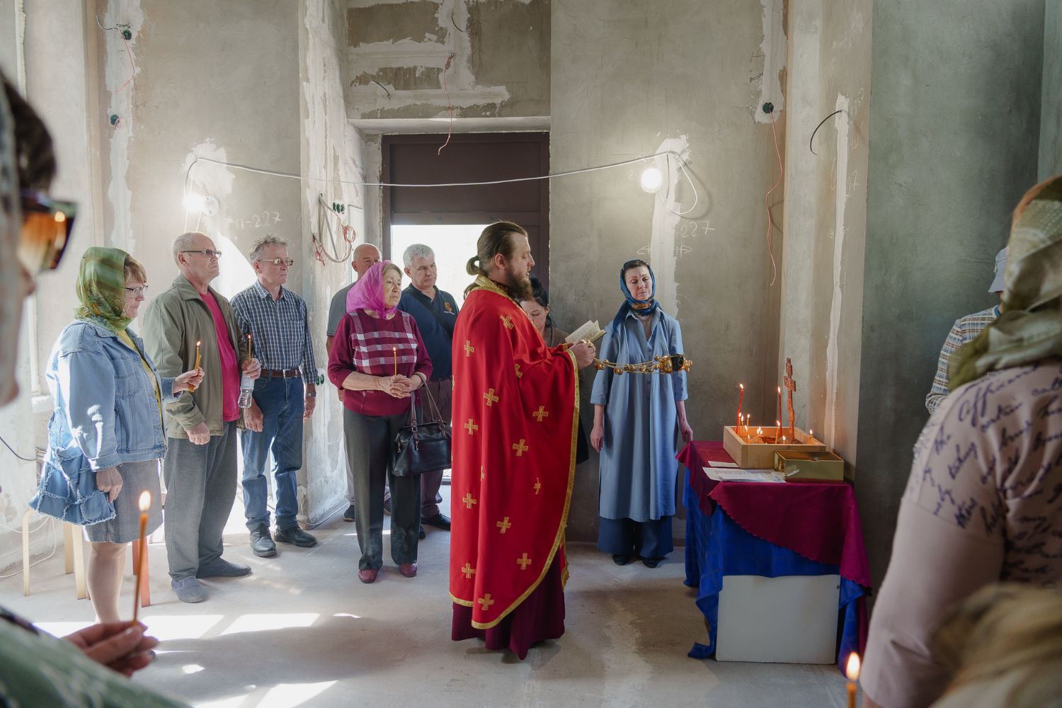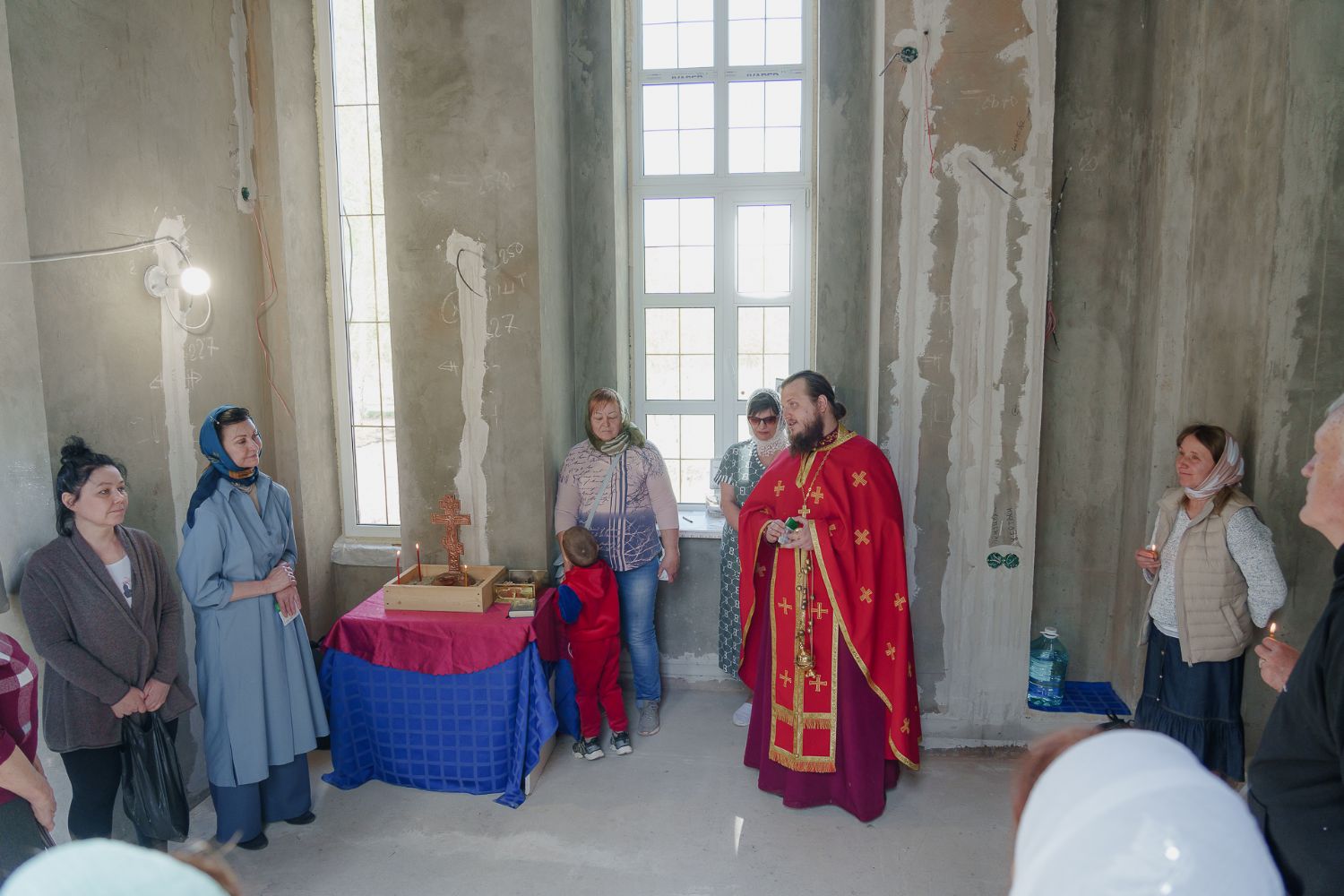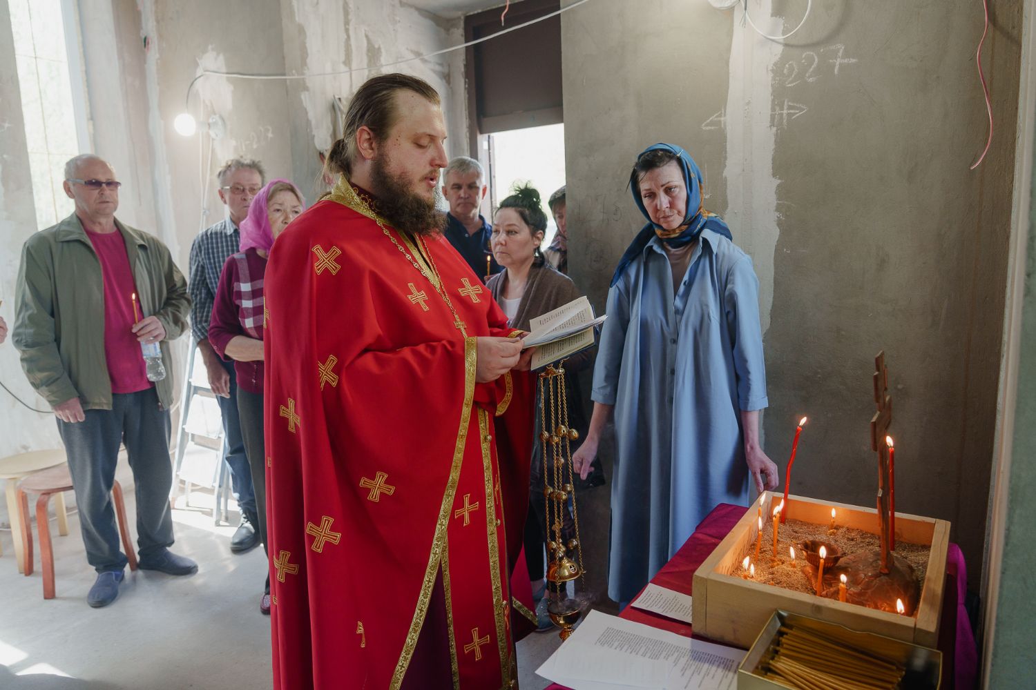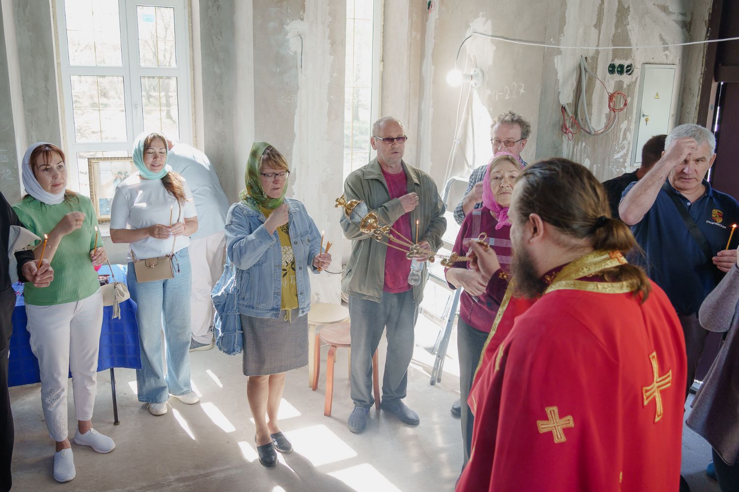 По завершении общей молитвы отец Александр поздравил всех с праздником и преподнём в подарок каждому молящемуся небольшой подарок - карманный церковный календарь с изображением строящегося храма-часовни. Батюшка отметил, что в богослужебной жизни прихода придётся сделать небольшой временный перерыв - ради окончания внутренних отделочных работ. О расписании богослужений в июнн 2024 года будет сообщено дополнительно.