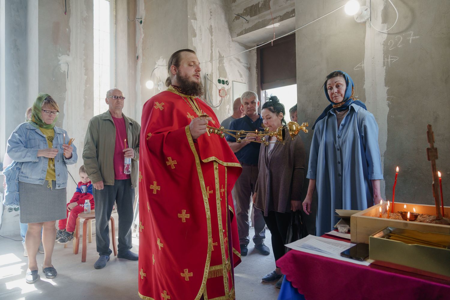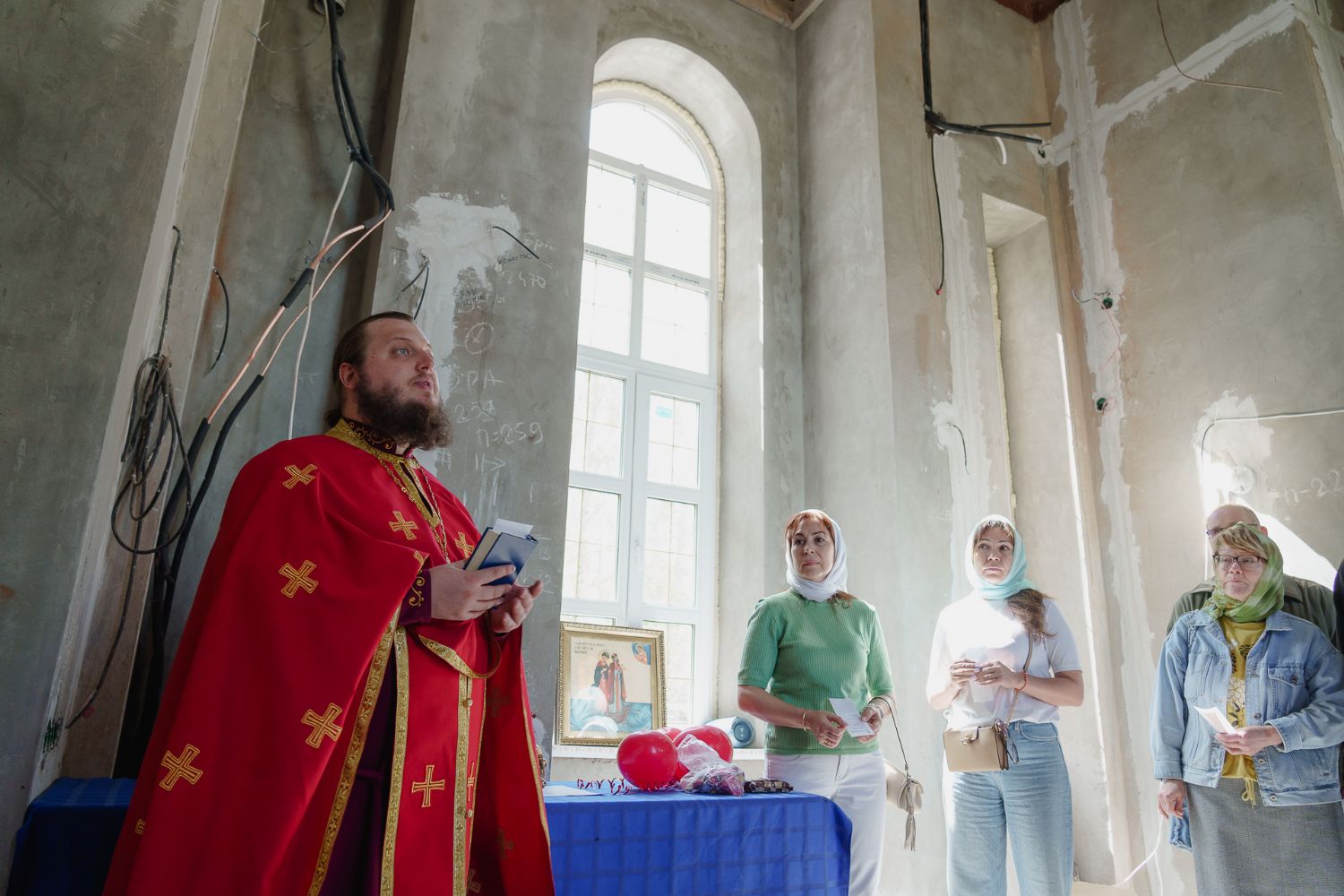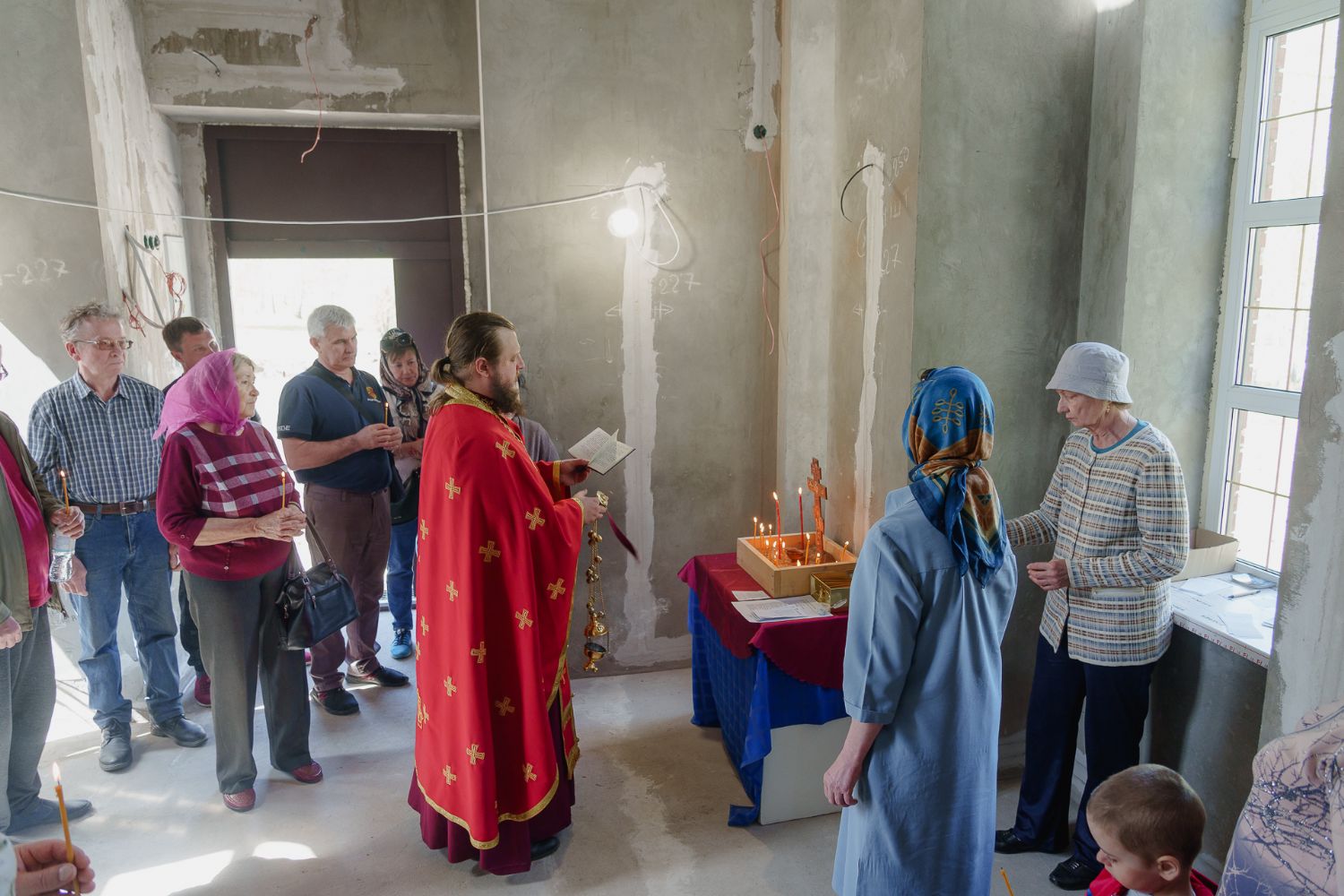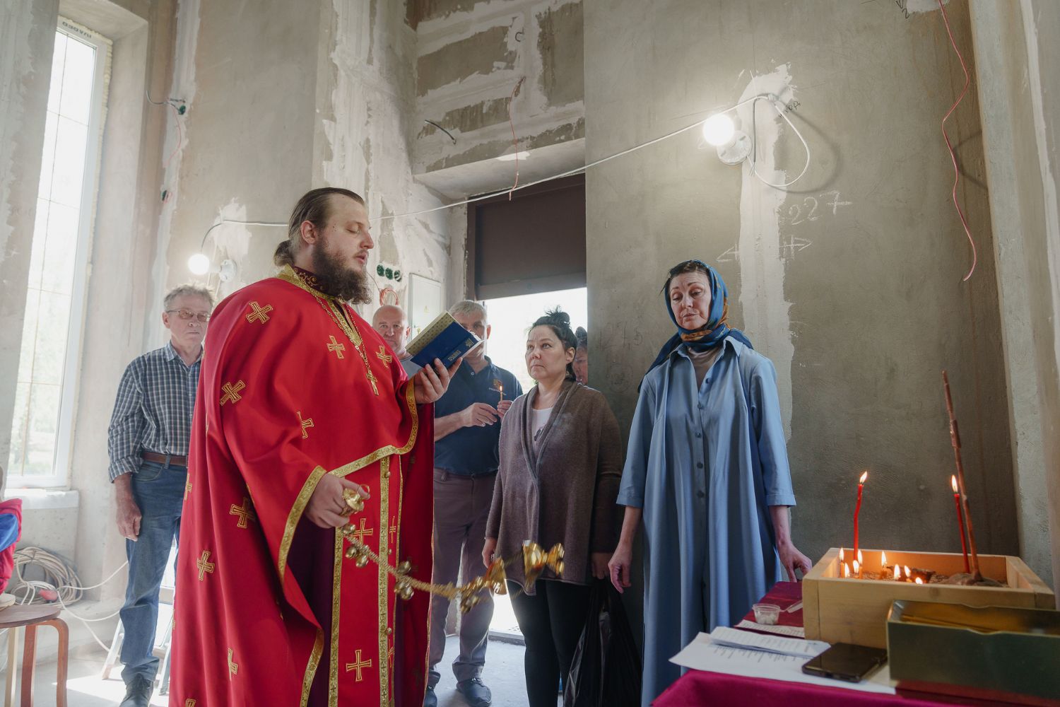 По завершении общей молитвы отец Александр поздравил всех с праздником и преподнём в подарок каждому молящемуся небольшой подарок - карманный церковный календарь с изображением строящегося храма-часовни. Батюшка отметил, что в богослужебной жизни прихода придётся сделать небольшой временный перерыв - ради окончания внутренних отделочных работ. О расписании богослужений в июнн 2024 года будет сообщено дополнительно.