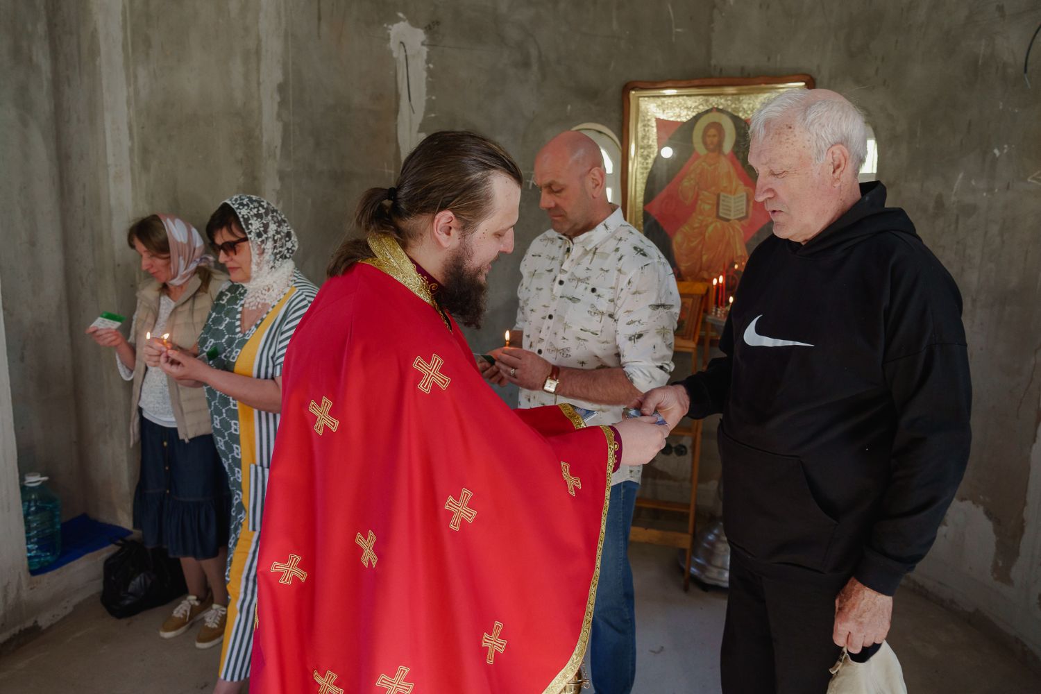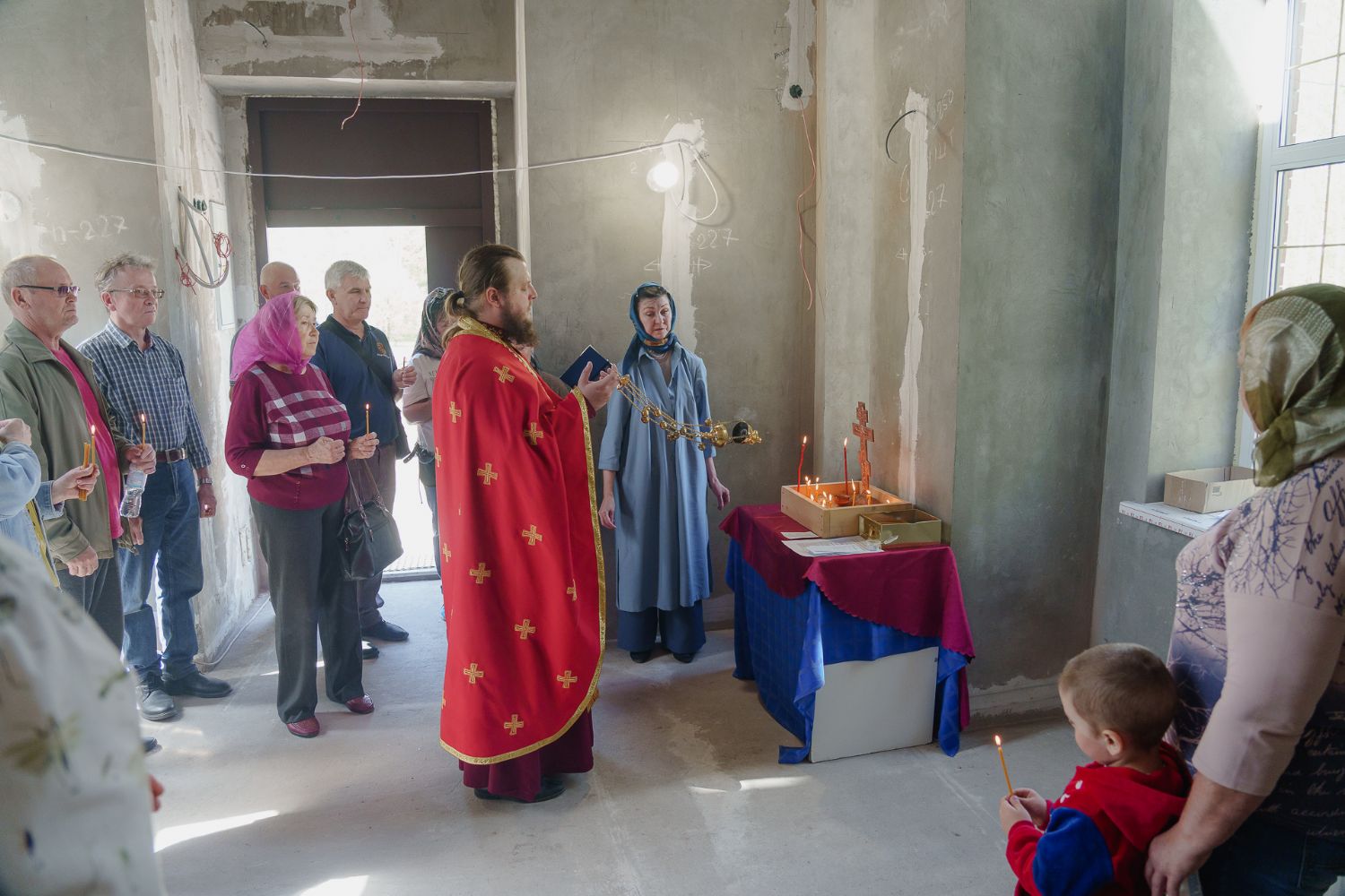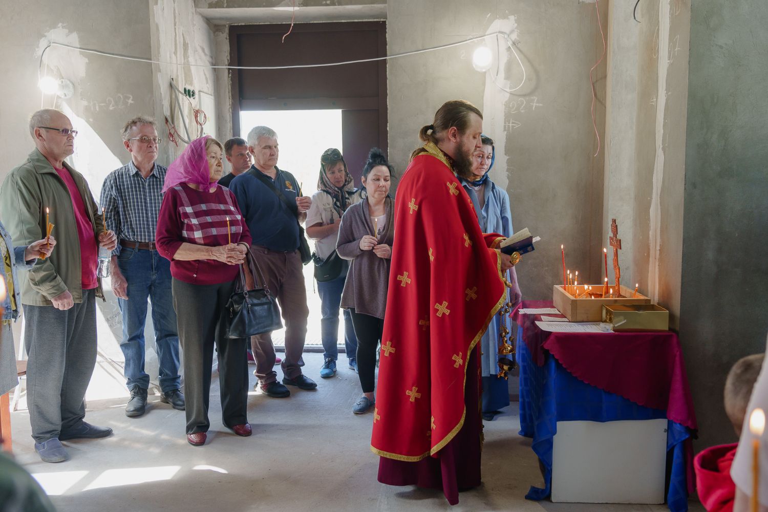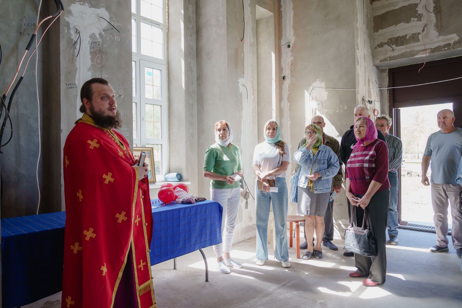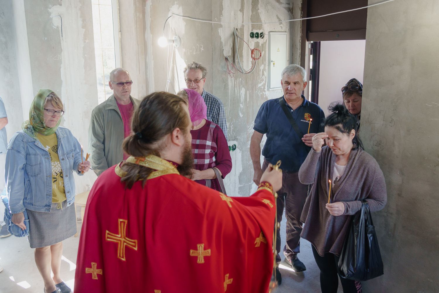 По завершении общей молитвы отец Александр поздравил всех с праздником и преподнём в подарок каждому молящемуся небольшой подарок - карманный церковный календарь с изображением строящегося храма-часовни. Батюшка отметил, что в богослужебной жизни прихода придётся сделать небольшой временный перерыв - ради окончания внутренних отделочных работ. О расписании богослужений в июнн 2024 года будет сообщено дополнительно.