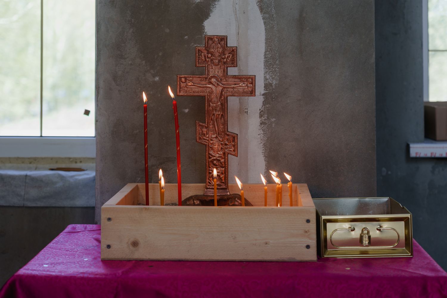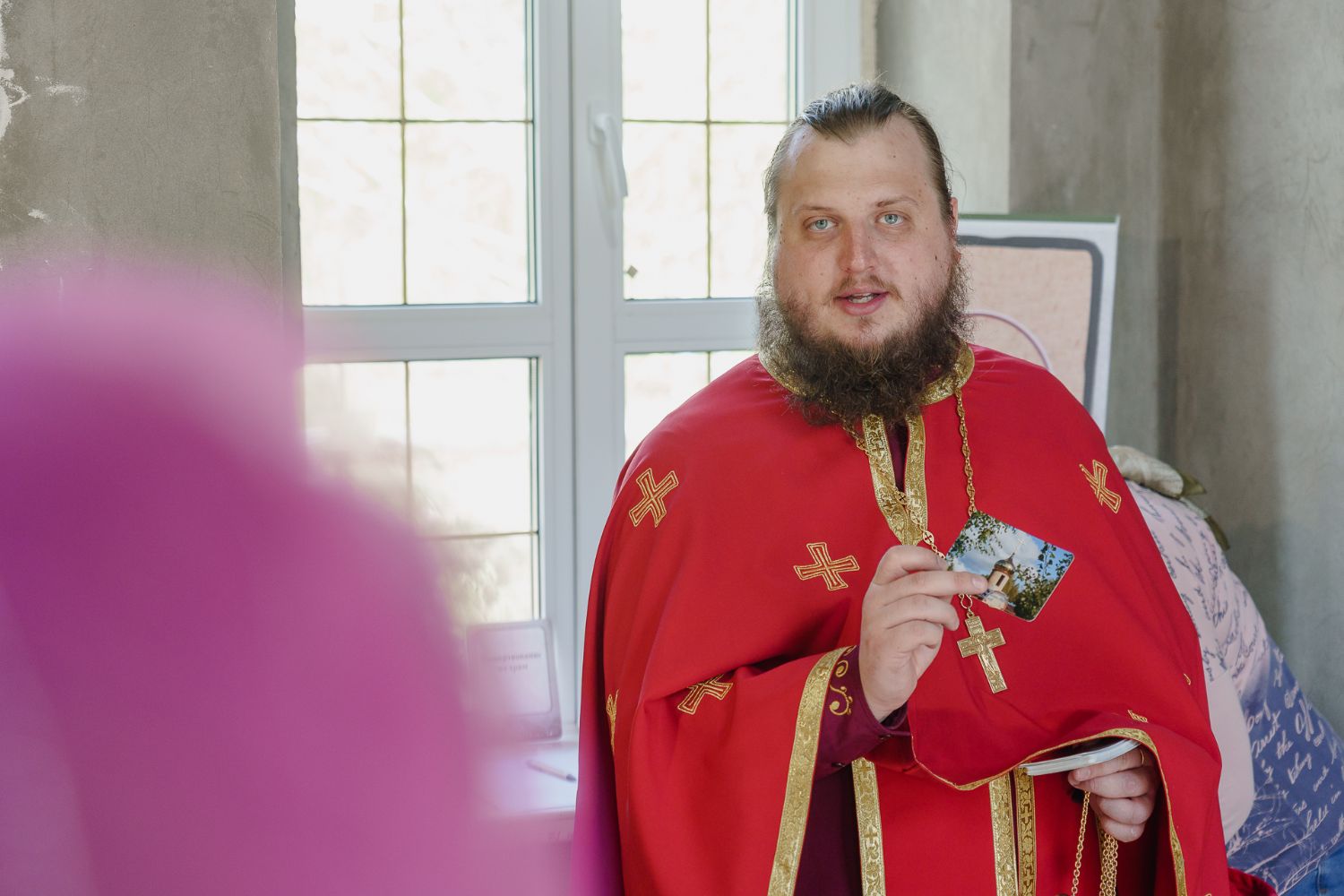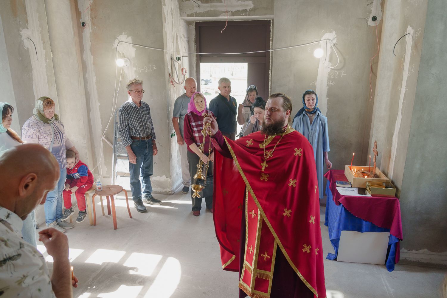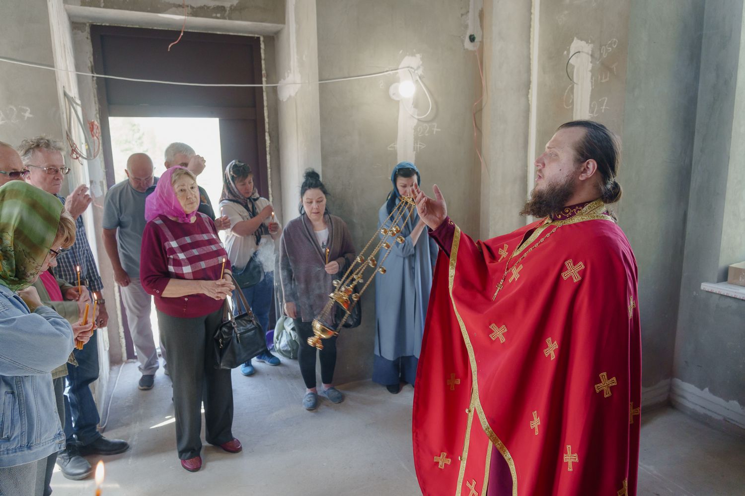По завершении общей молитвы отец Александр поздравил всех с праздником и преподнём в подарок каждому молящемуся небольшой подарок - карманный церковный календарь с изображением строящегося храма-часовни. Батюшка отметил, что в богослужебной жизни прихода придётся сделать небольшой временный перерыв - ради окончания внутренних отделочных работ. О расписании богослужений в июнн 2024 года будет сообщено дополнительно.