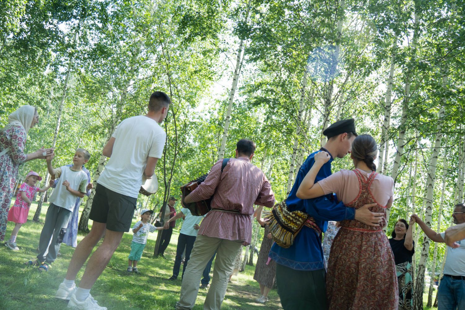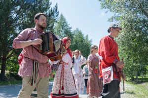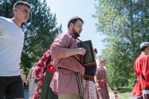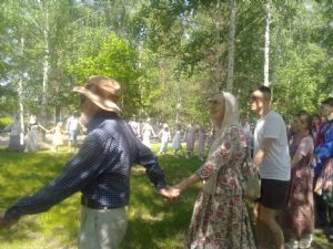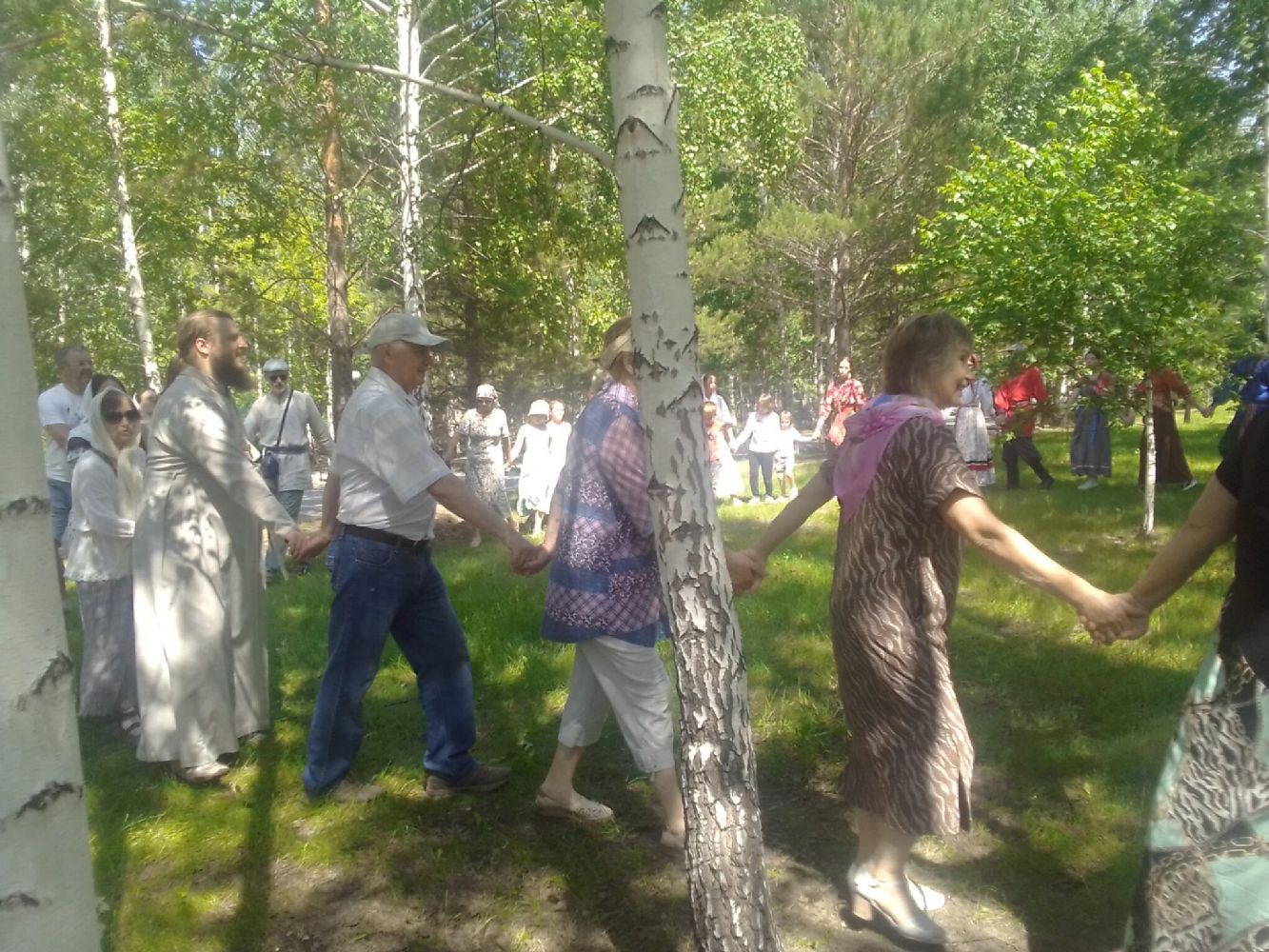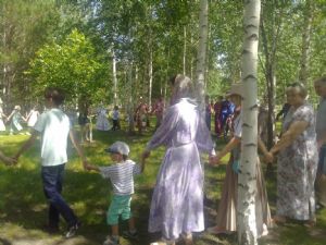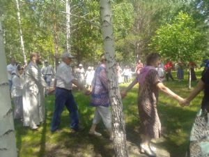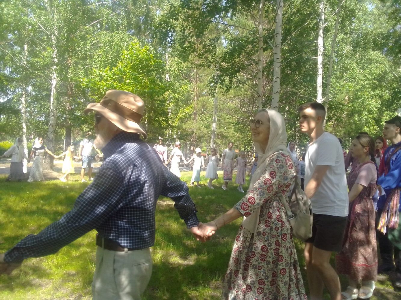 По окончании богослужения верующие поселка Озёрный встречали дорогих гостей - прихожан храма святителя Николая Чудотворца д.п.Мочище вместе с настоятелем иереем Анатолием Рублёвым. Старший сын отца Анатолий Егор Рублёв вместе со своими товарищами организовал на территории большого сквера ЖСК "Ключевой" народные Троицкие гулянья.
