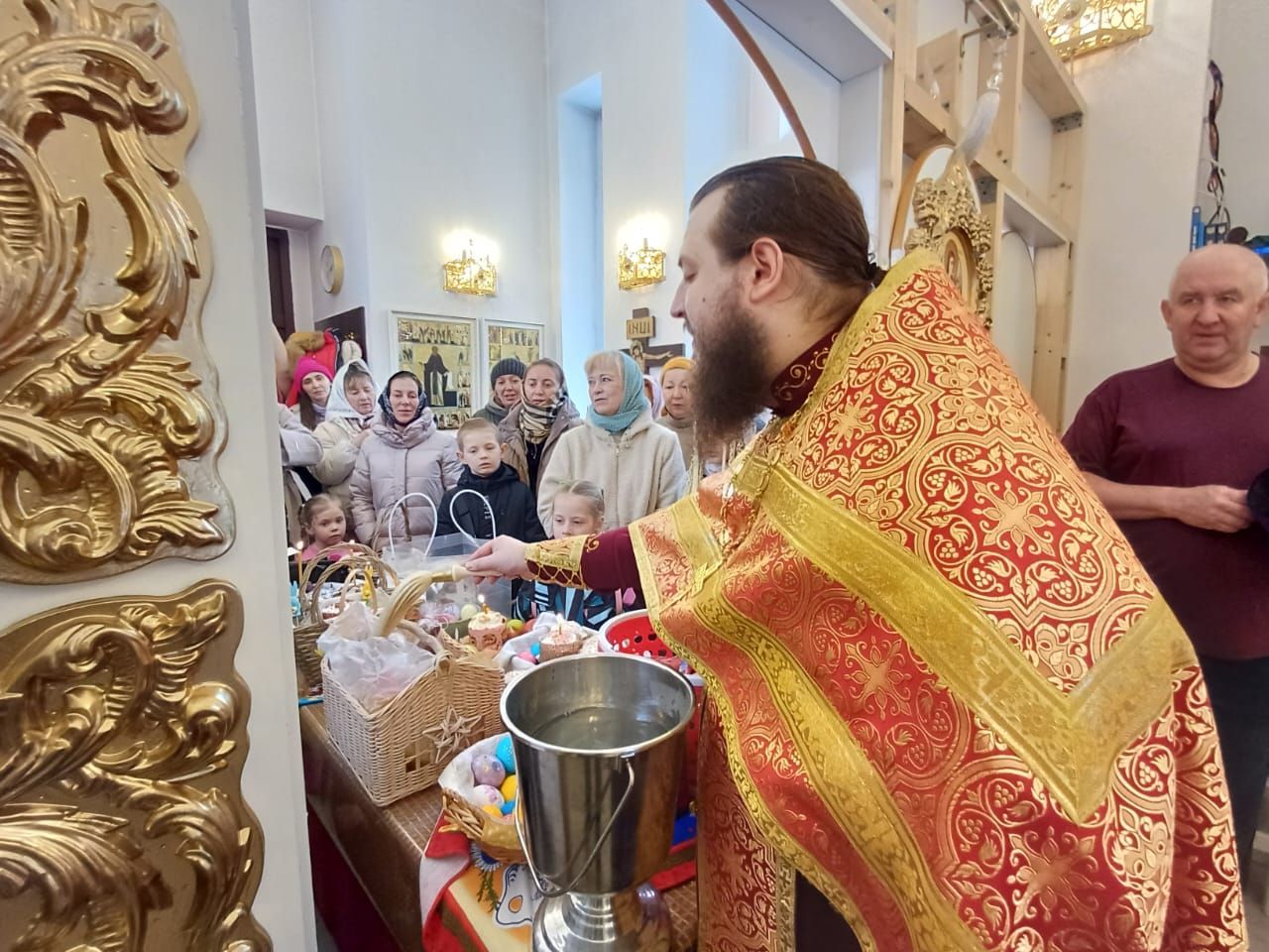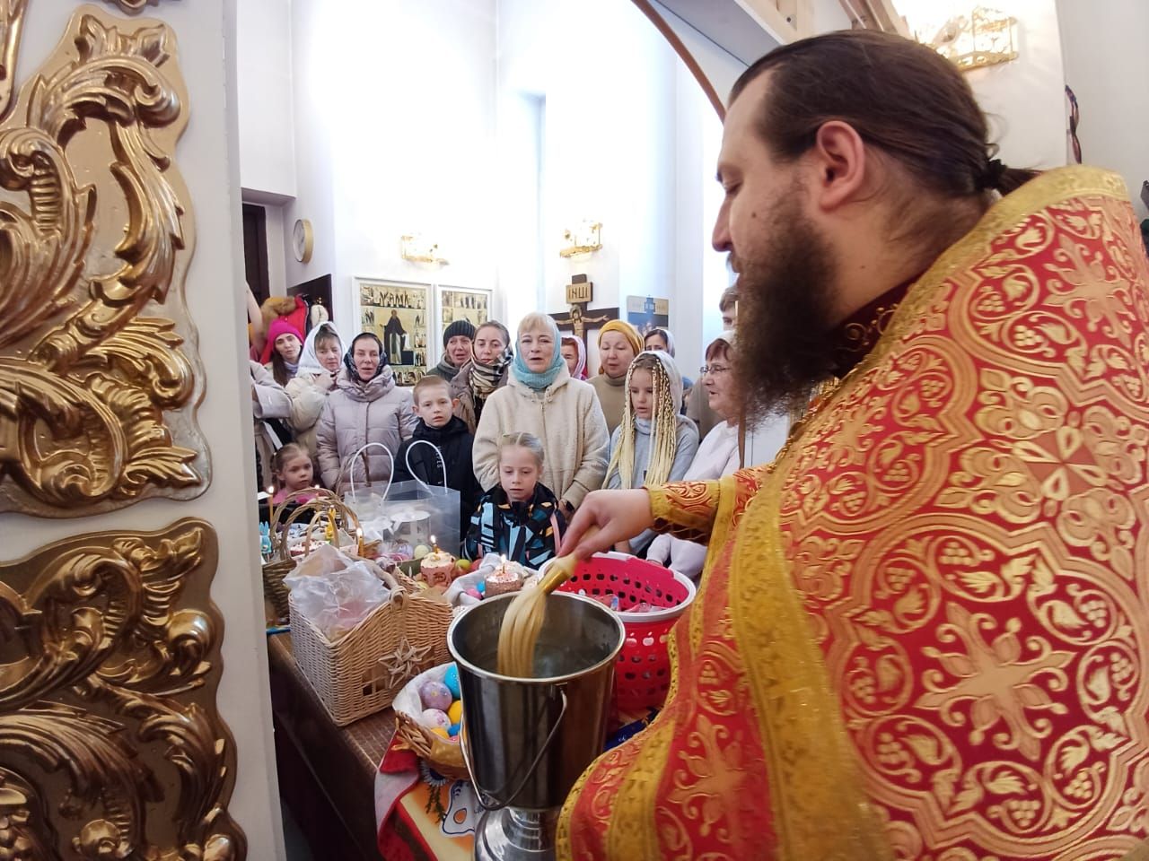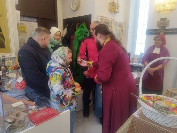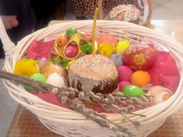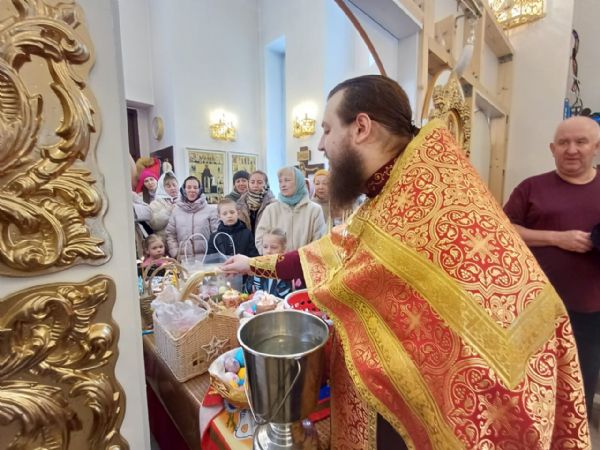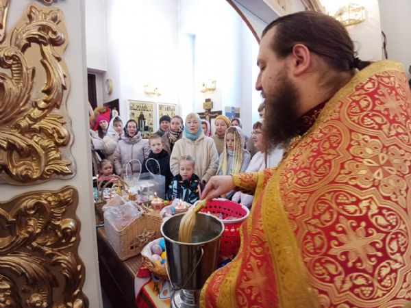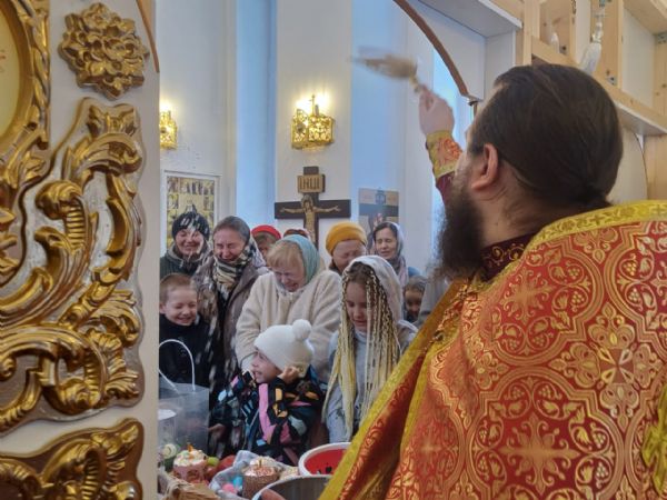 Затем, после чтения молитвы на освящение пасхальных яств отец Александр окропил святой водой принесённые пасхальные угощения. Все дети получили в подарок большие шоколадные яйца, а все взрослые — шоколадные монетки.