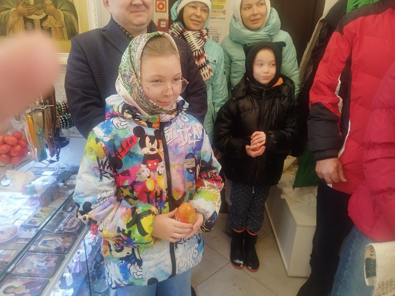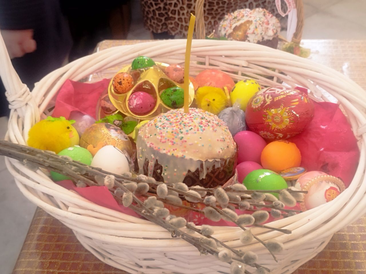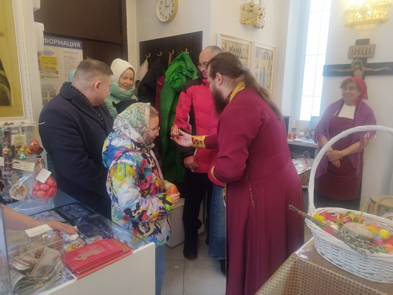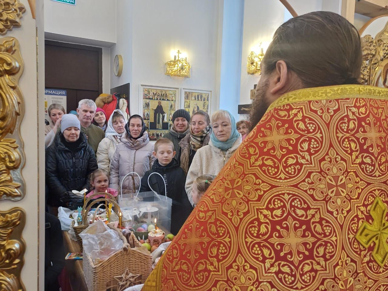 Затем, после чтения молитвы на освящение пасхальных яств отец Александр окропил святой водой принесённые пасхальные угощения. Все дети получили в подарок большие шоколадные яйца, а все взрослые — шоколадные монетки.