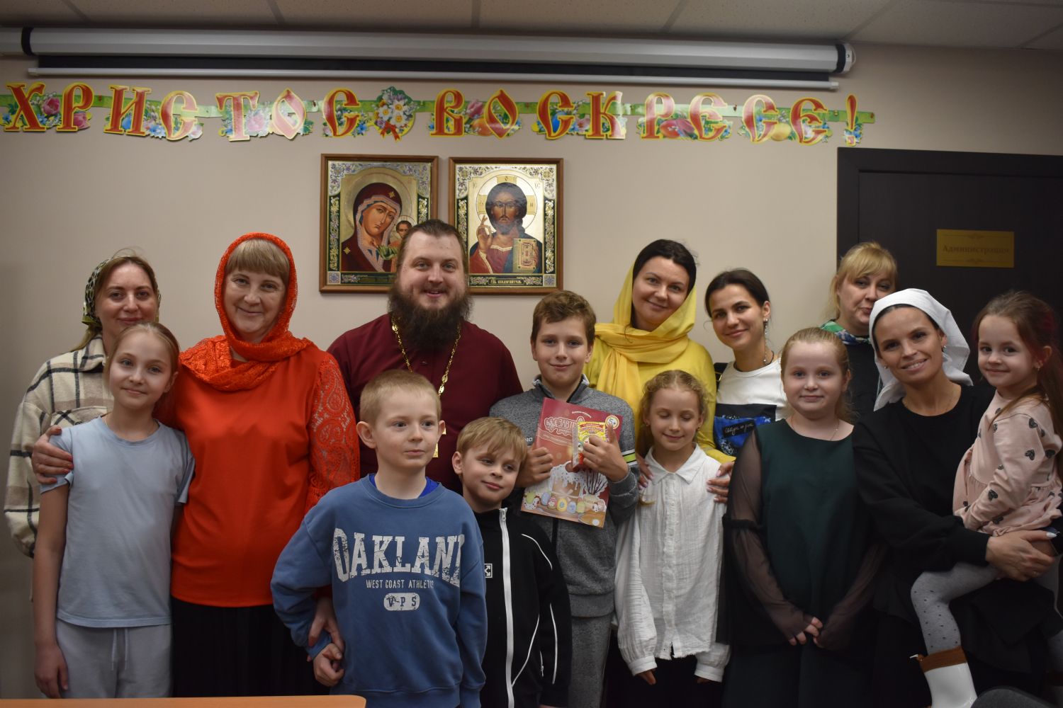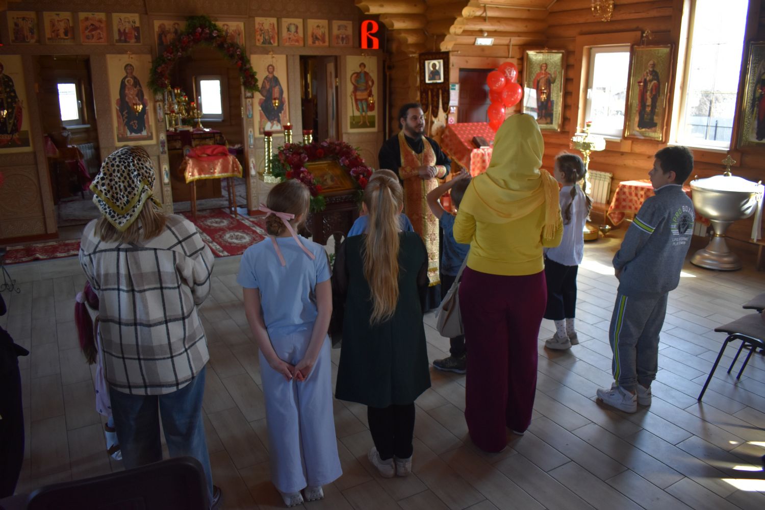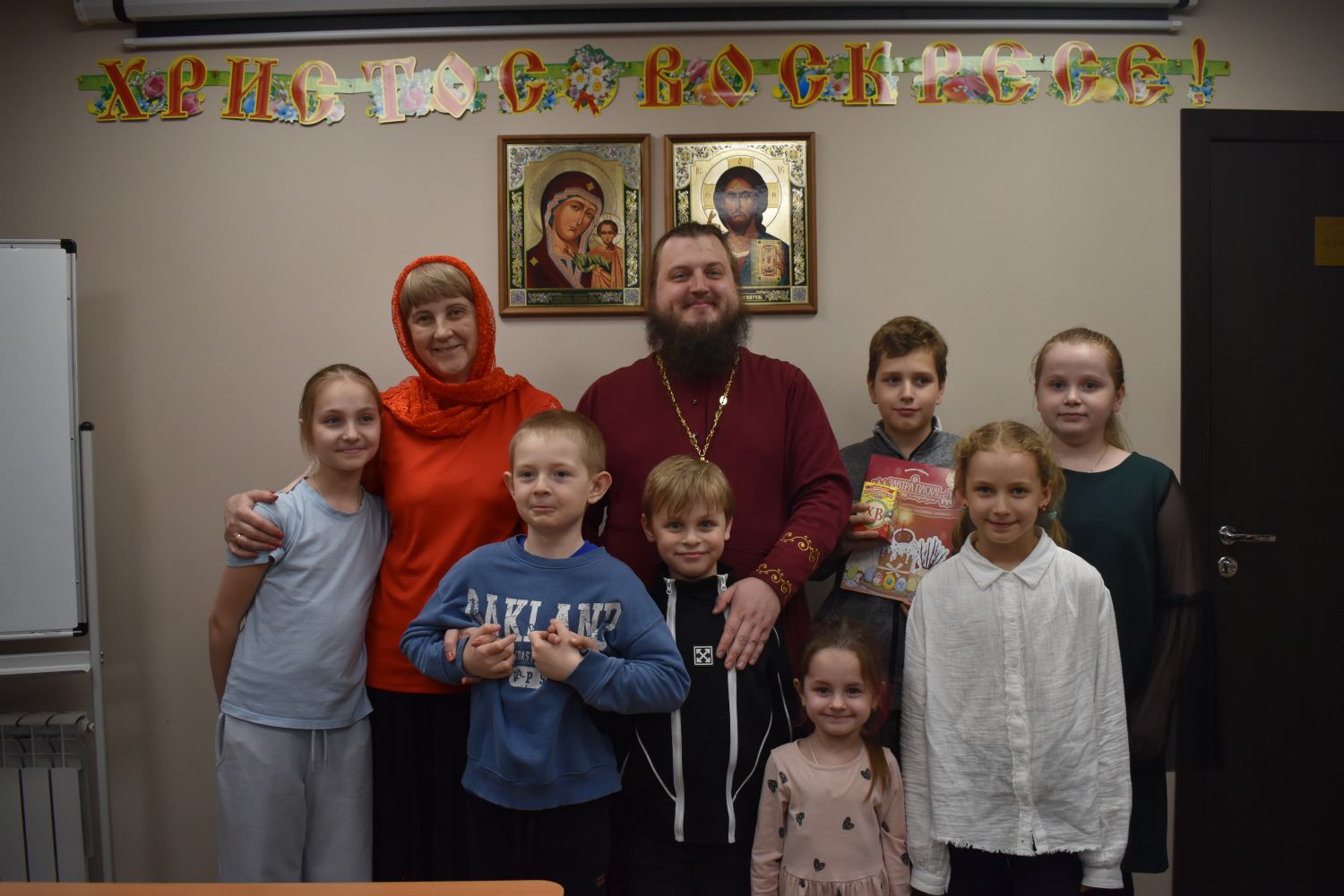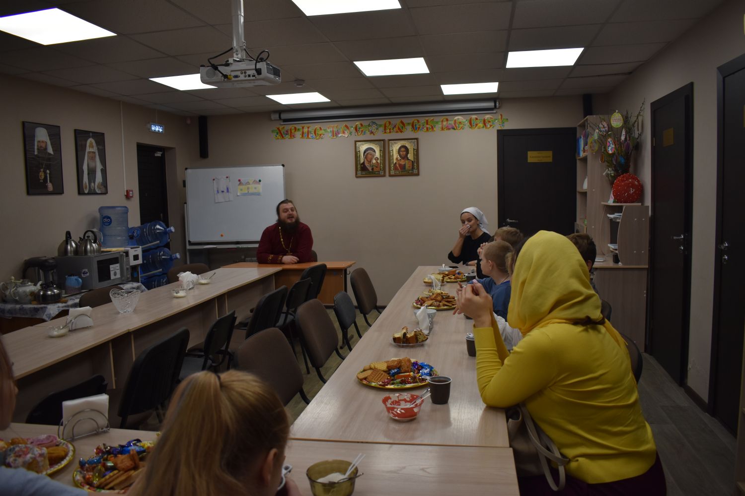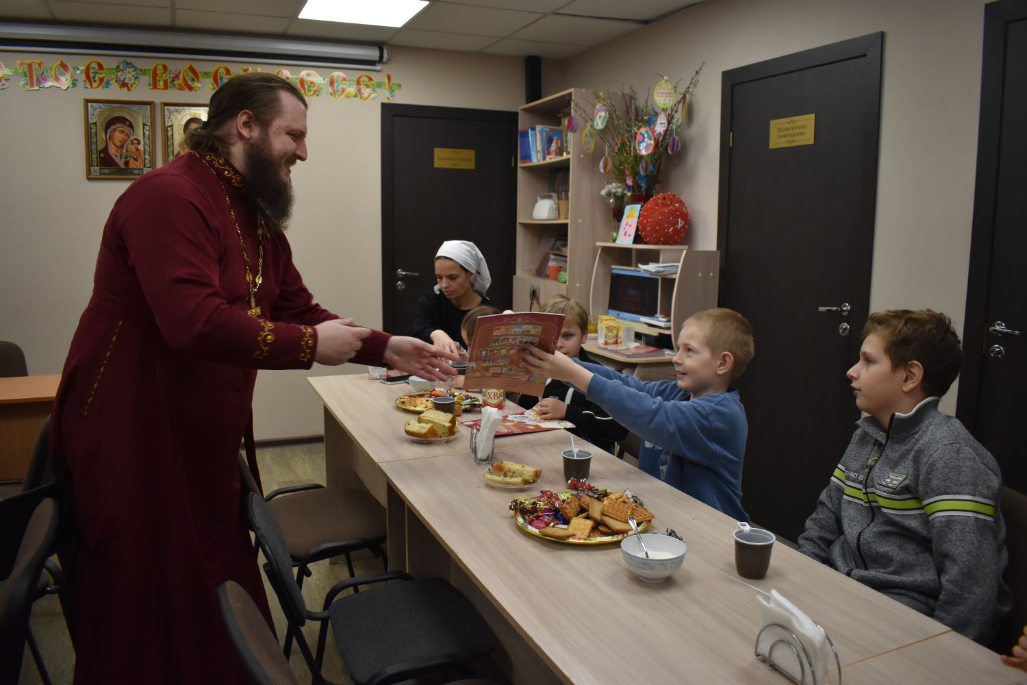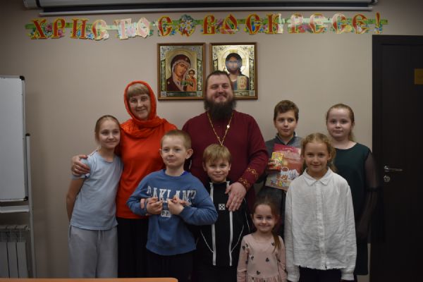 В цокольном этаже группу экскурсантов встречал настоятель обоих храмов иерей Александр Сахненко. Батюшка сердечно приветствовал ребят, рассказал им о деятельности Георгиевского храма и включил мультфильм о его небесном покровители. В завершении встречи дети вновь вспомнили вместе с отцом Александром особенности праздника Пасхи и получили пасхальные подарки.
