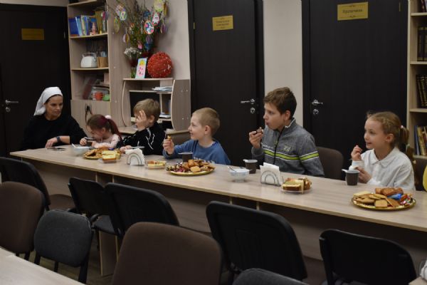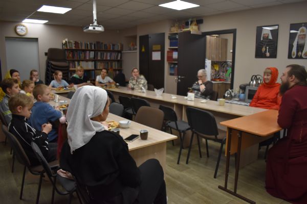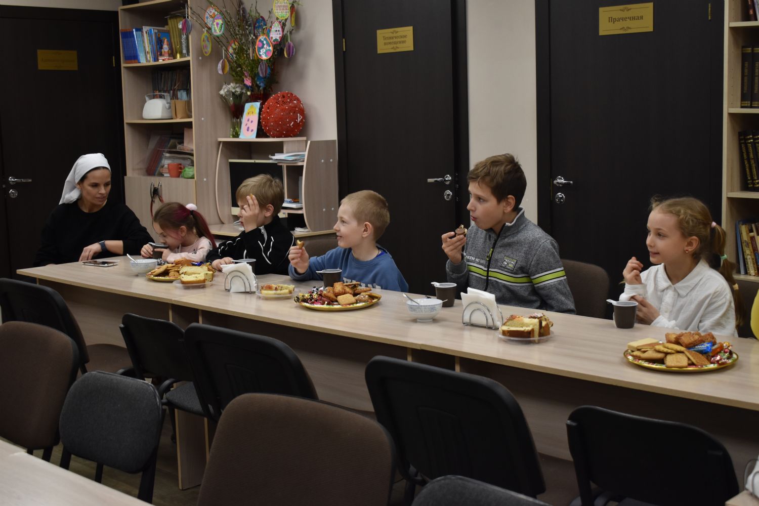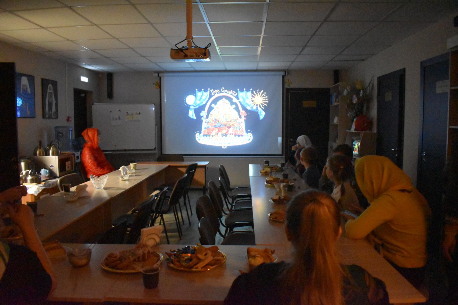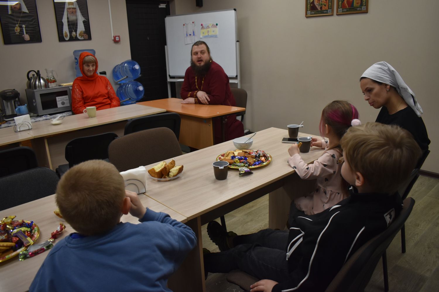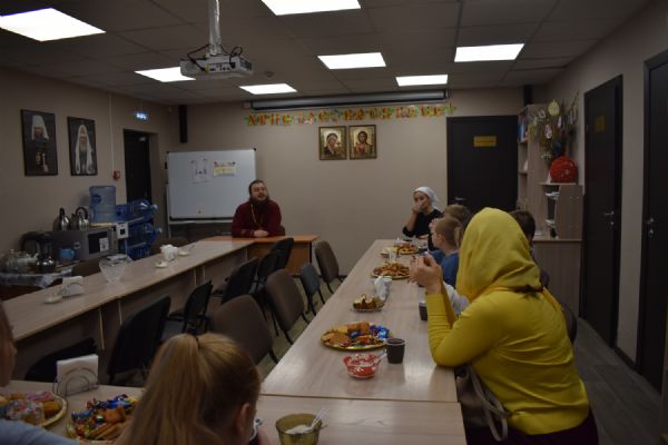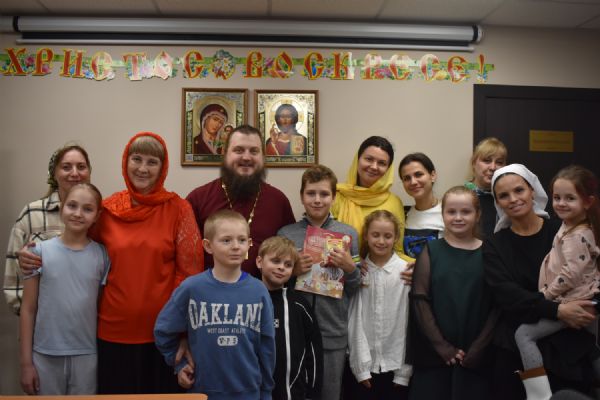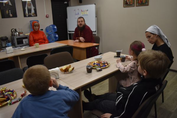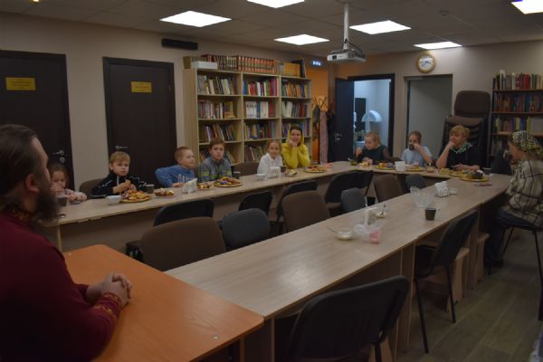 В цокольном этаже группу экскурсантов встречал настоятель обоих храмов иерей Александр Сахненко. Батюшка сердечно приветствовал ребят, рассказал им о деятельности Георгиевского храма и включил мультфильм о его небесном покровители. В завершении встречи дети вновь вспомнили вместе с отцом Александром особенности праздника Пасхи и получили пасхальные подарки.