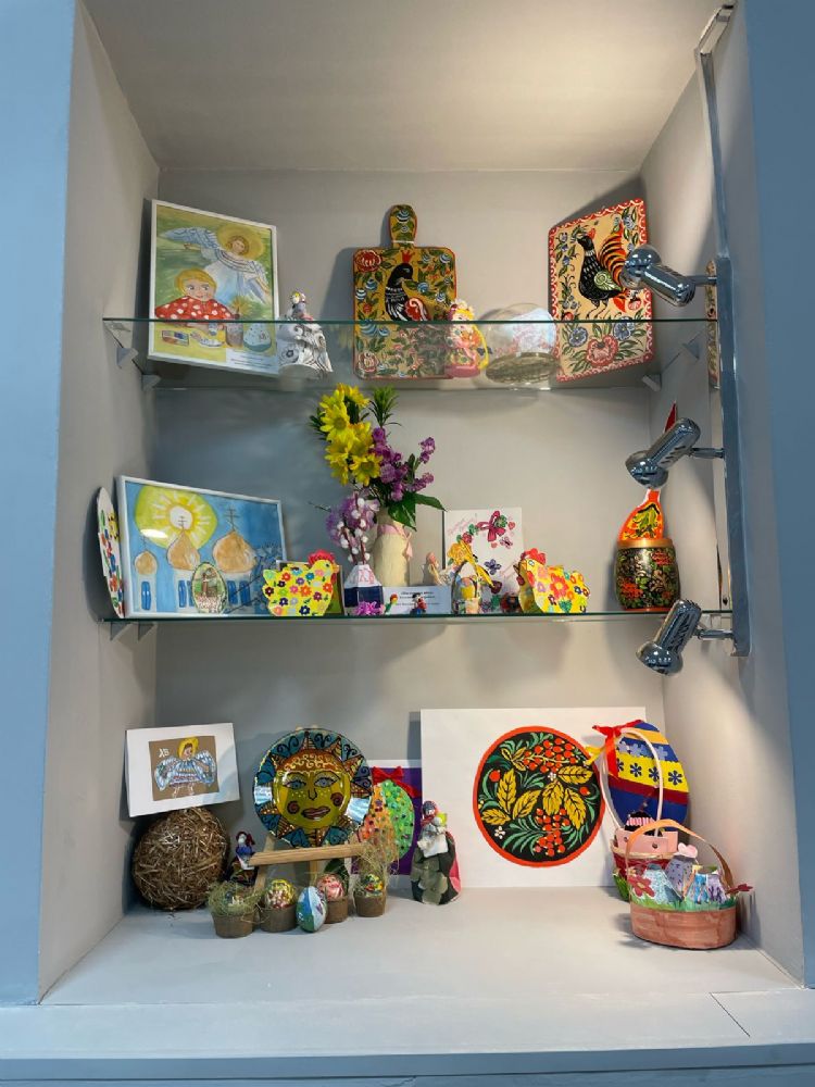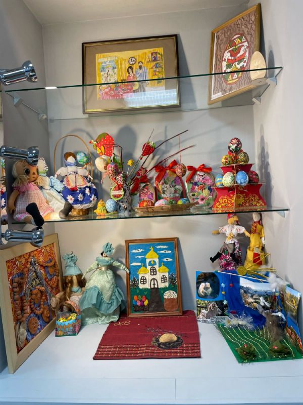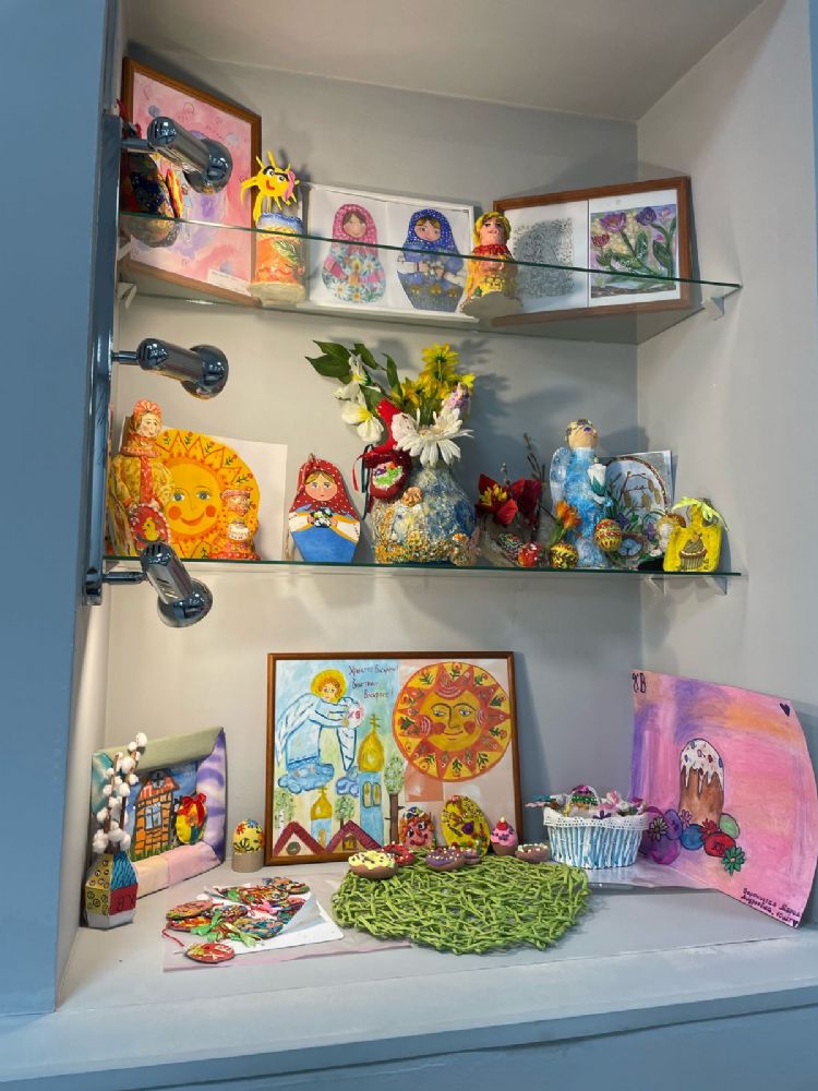 В холле центра была подготовлена выставка пасхальных поделок и рисунков, подготовленных к празднику участниками праздника.