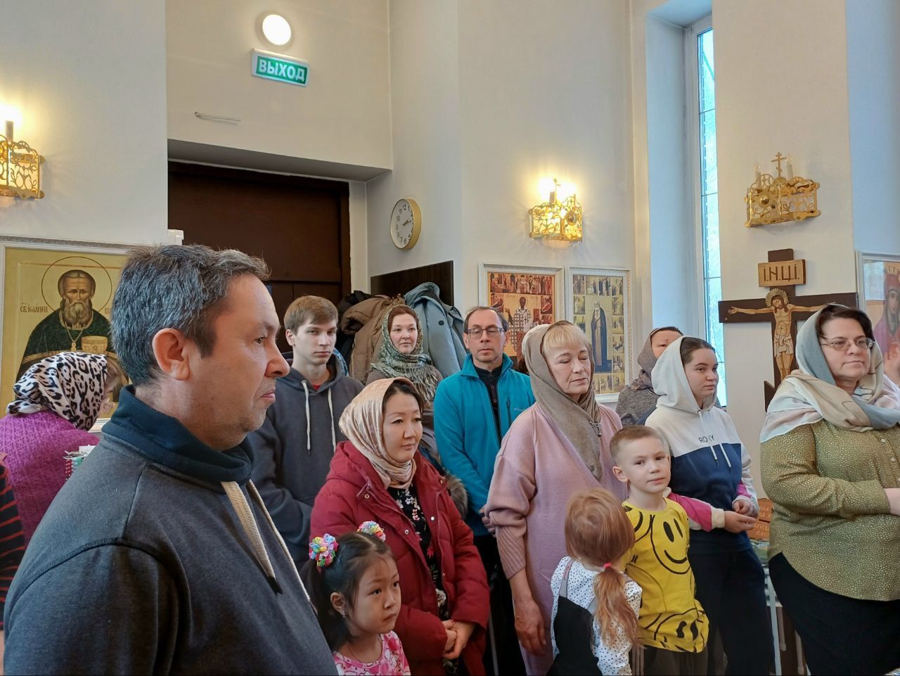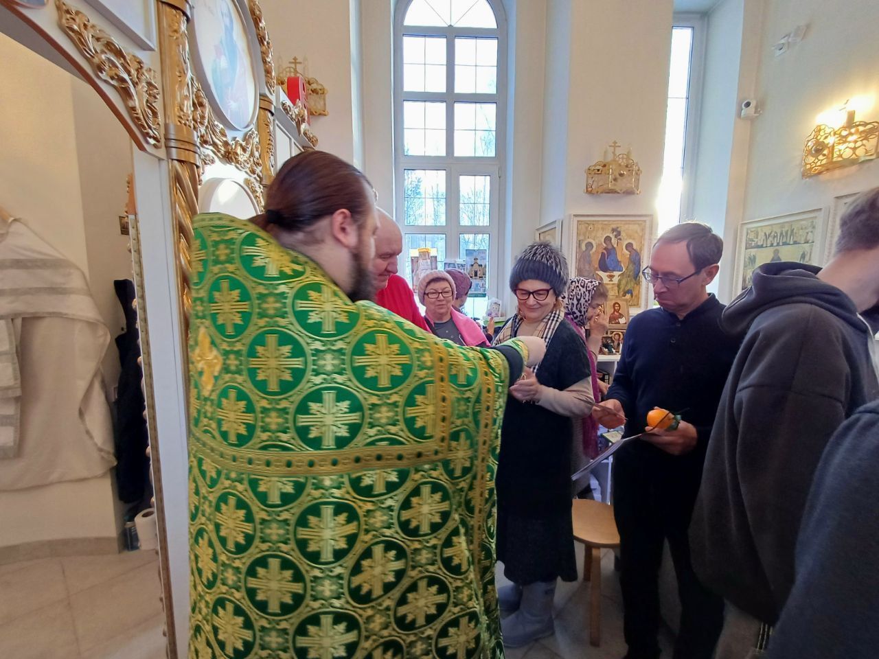 По завершении богослужения отец Александр произнёс тематическую проповедь и подарил каждому молящемуся сочный мандарин, свежий выпуск православного журнала "Юрьев день" и карманный церковный календарь на 2026 год с изображением храма-часовни Петра и Февронии Муромских п. Озёрный.