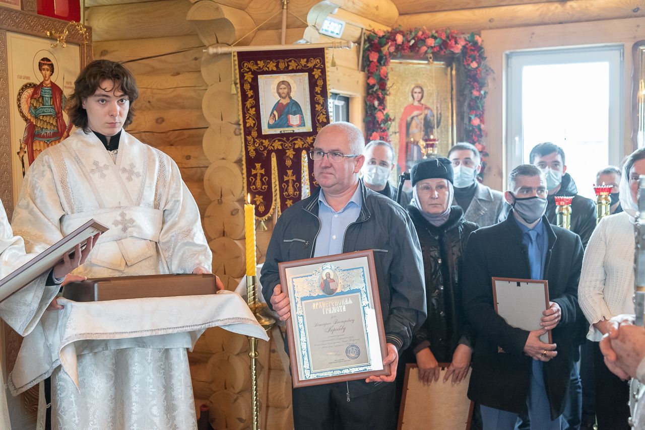 После освящения храма и крестного хода вокруг новопостроенного молитвенного здания была совершена Божественная литургия и владыка Никодим обратился к пастве со словом проповеди. Затем состоялось вручение церковных наград. Благословенной Архиерейской грамотой был награжден Д. В. Коробов во внимание к активным трудам по созиданию храма святого великомученика Георгия. Завершилась официальная часть праздничной трапезой.