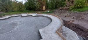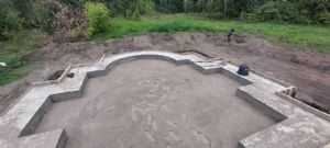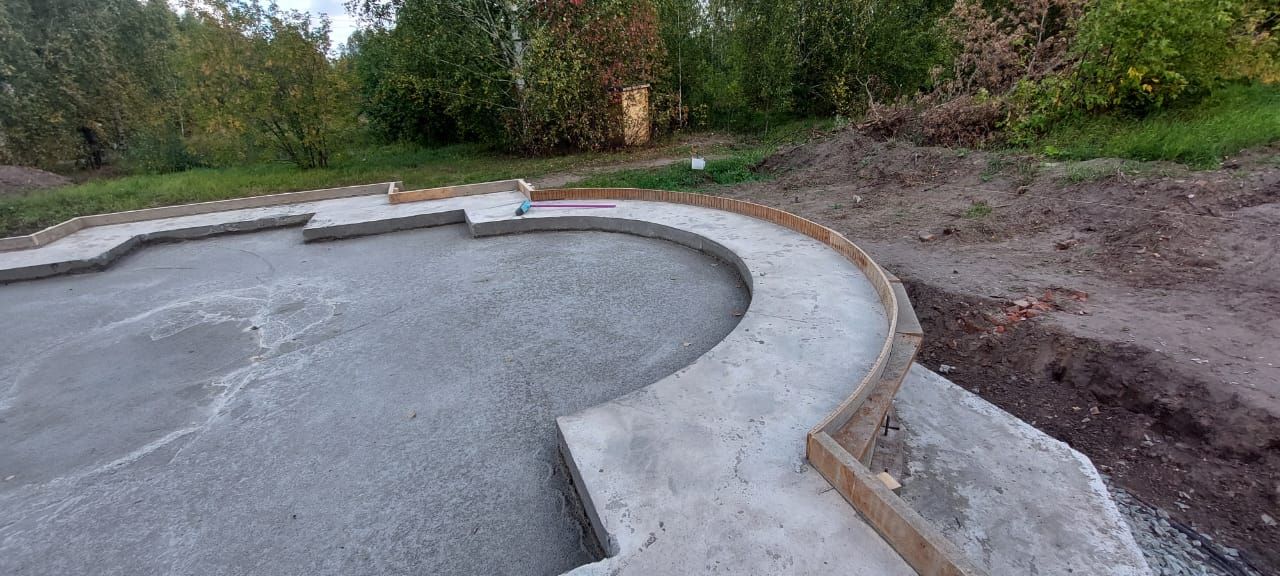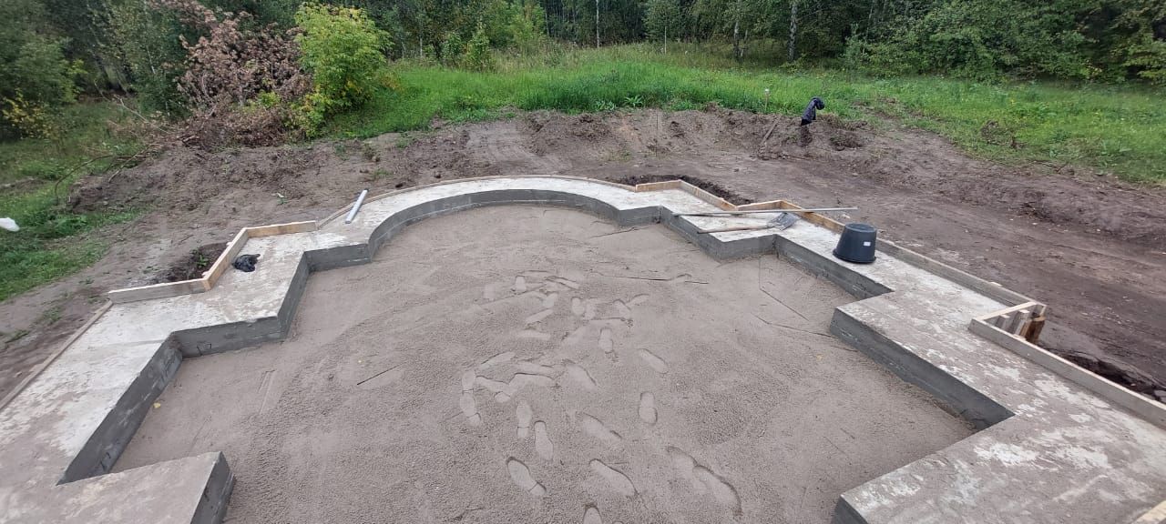 Были произведены армирование и заливка нижней плиты фундамента, установка опалубки для ленточной части фундамента, армирование ленточной части фундамента и заливка ленточной части фундамента.