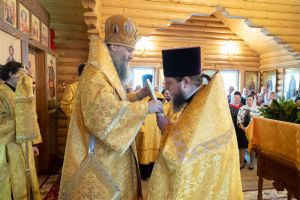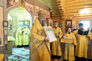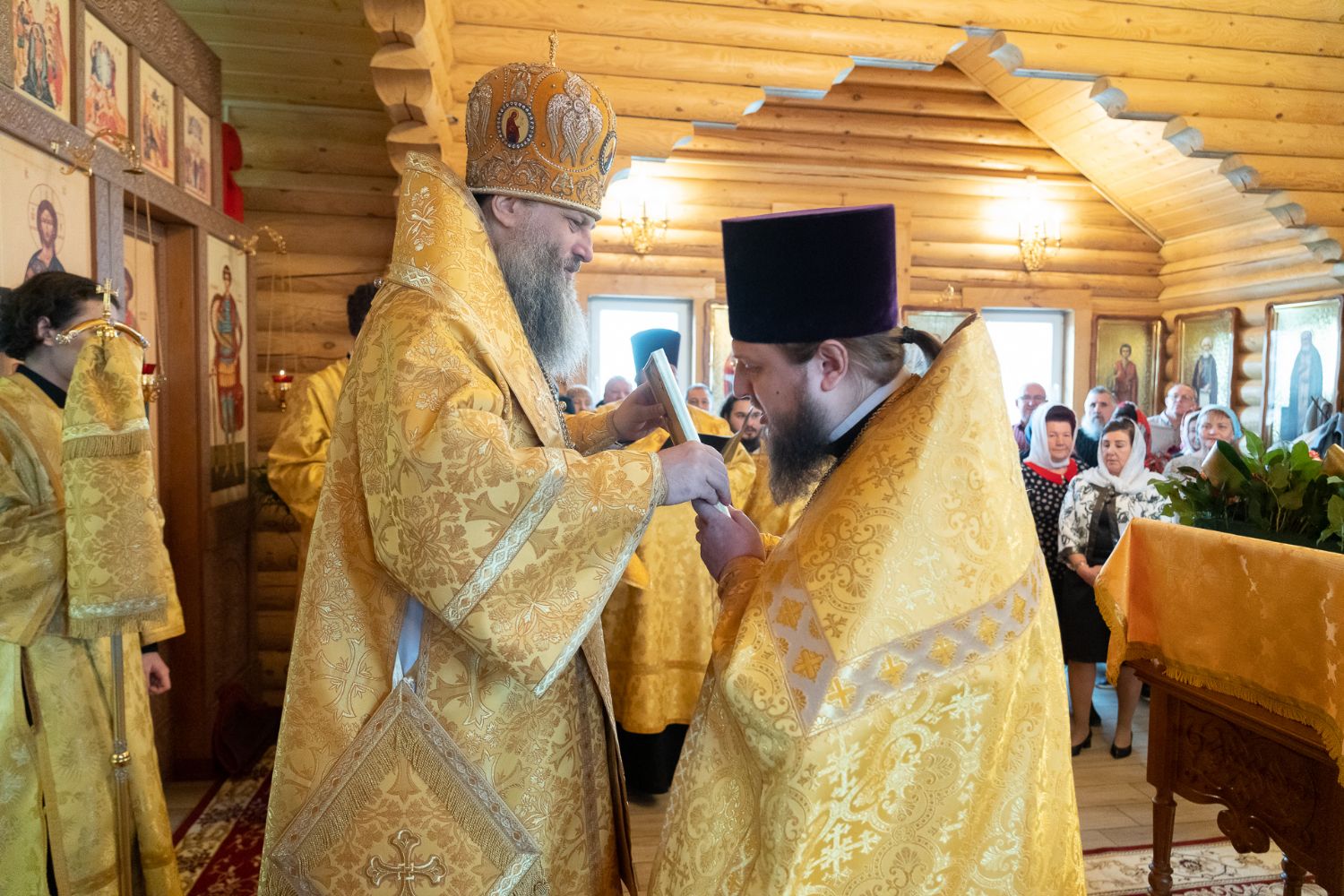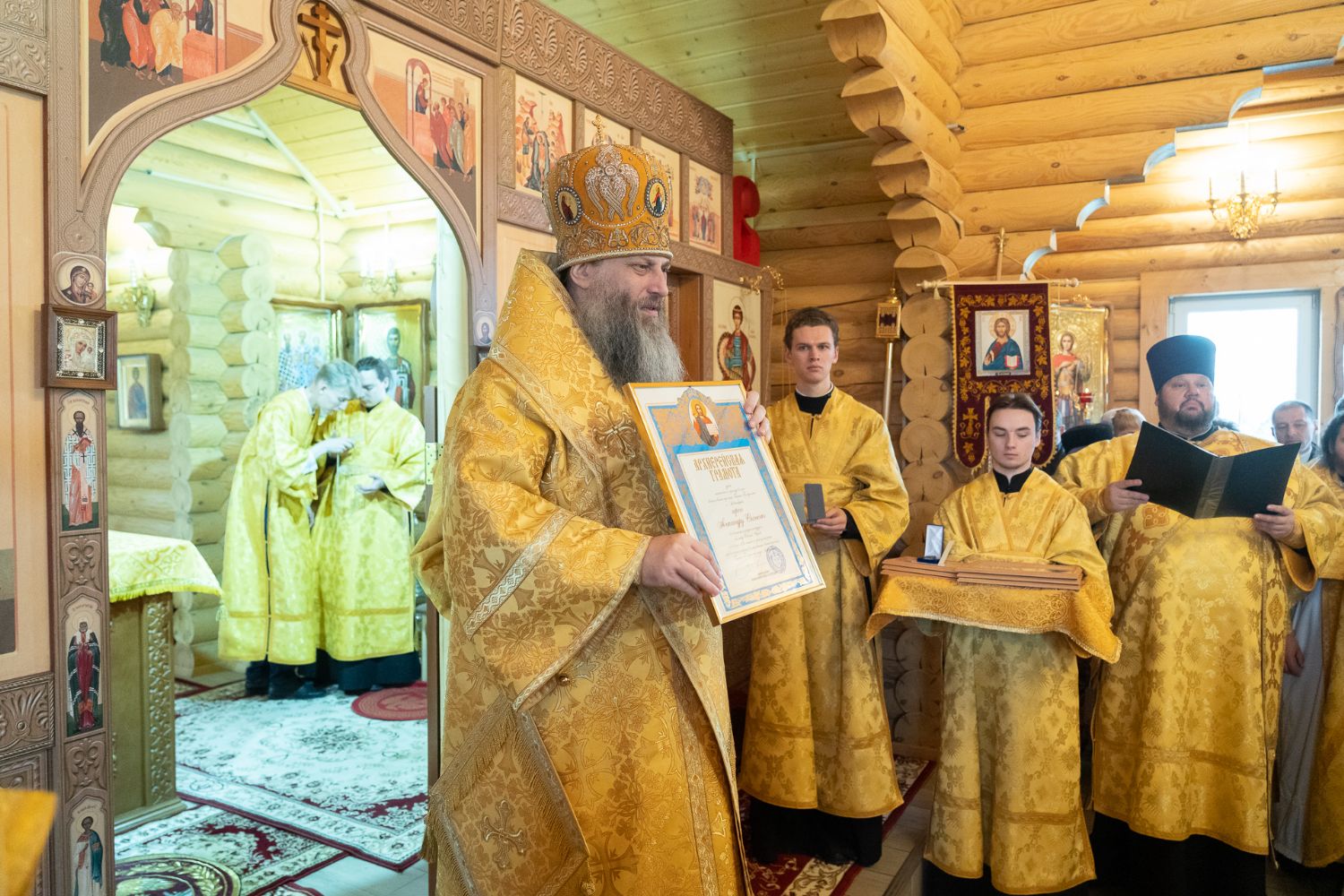 После совершения праздничной Божественной литургии и архипастырского слова митрополит Никодим вручил церковные награды особо потрудившимся на благо приходской общины. Благословенной Архиерейской грамоты был удостоен настоятель храма Георгия Победоносца, настоятель прихода храма Петра и Февронии Муромских п. Озерный иерей Александр Сахненко.