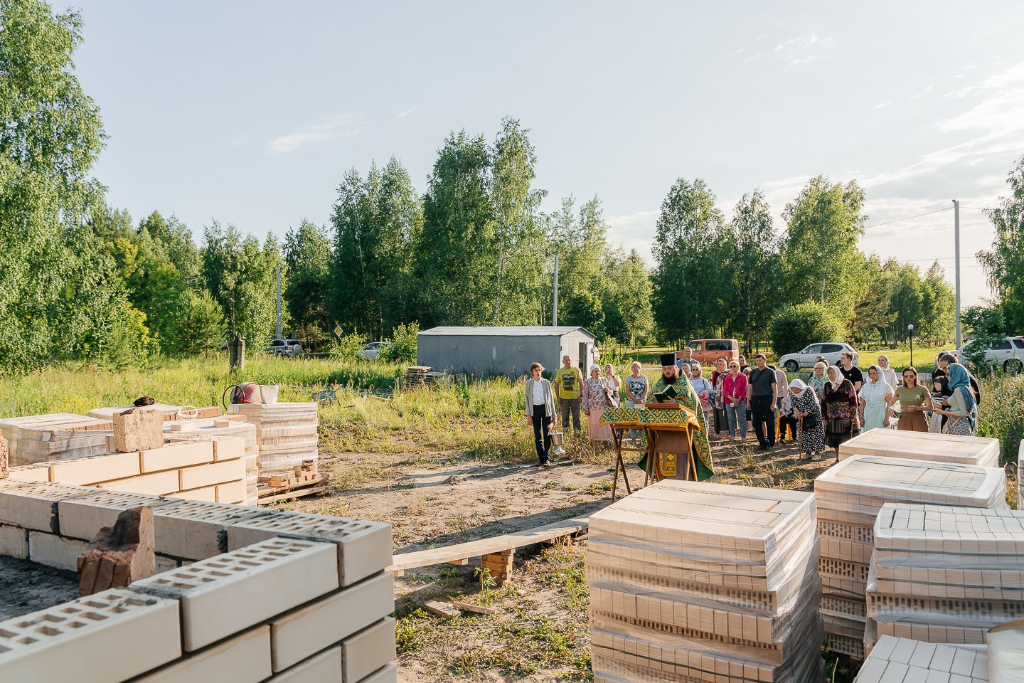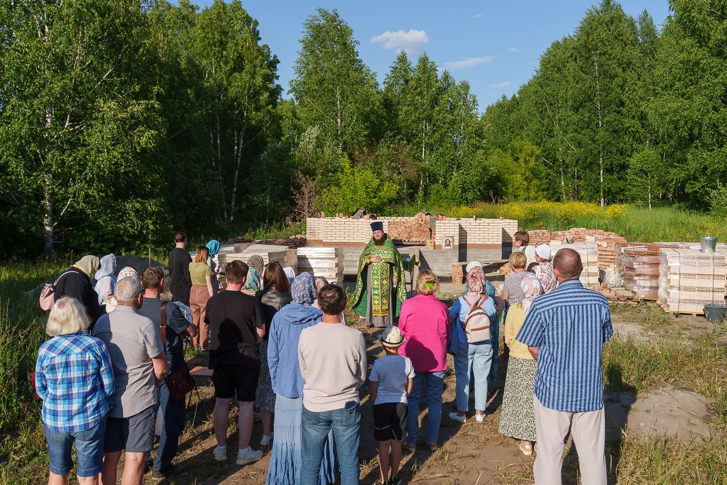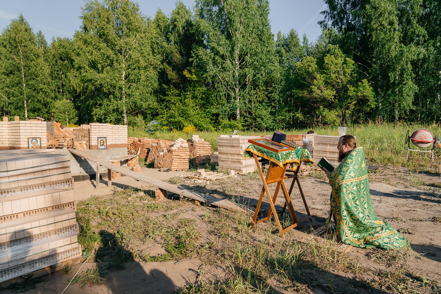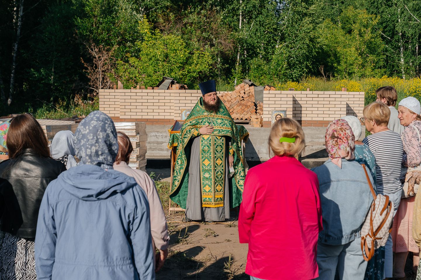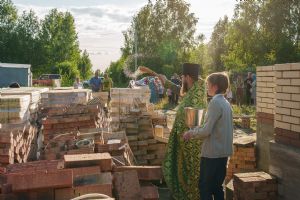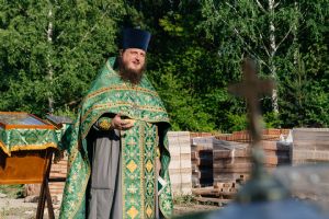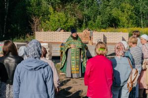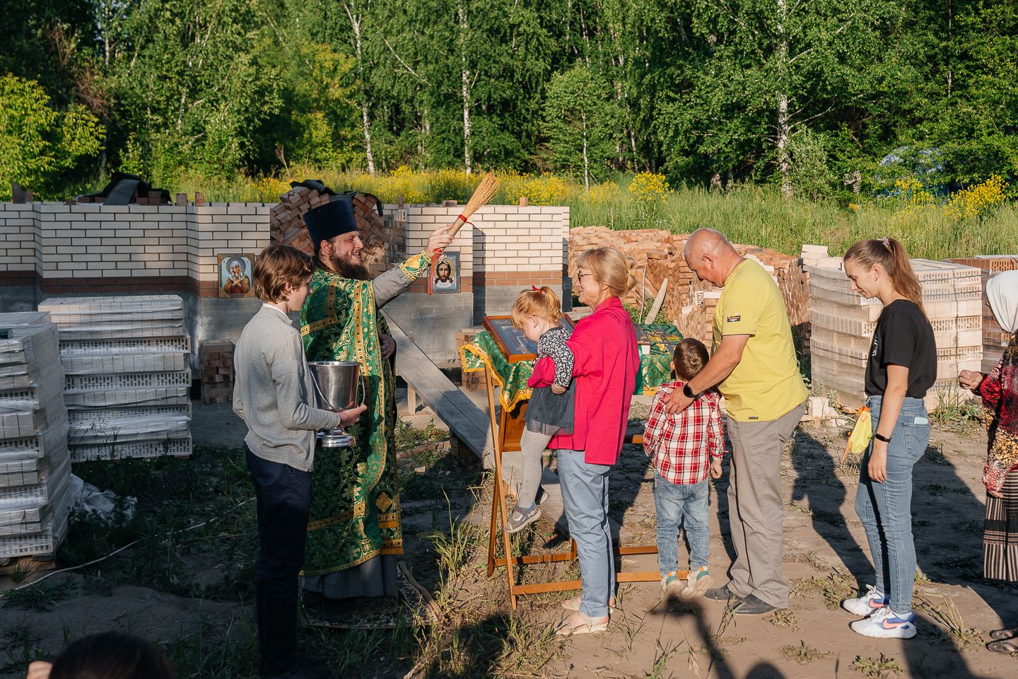 Отец Александр окропил святой водой кирпичи перед дальнейшей работой строителей по возведению стен храмового здания, а также после краткого молебна святым покровителям храма окропил водой каждого присутствующего на молебне молитвенника. Батюшка передал собравшимся слова приветствия от Правящего Архиерея, а также сказал краткую проповедь, призвав неустанно жертвовать на строительство храма и помогать в строительстве любым возможным способом.