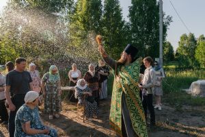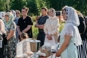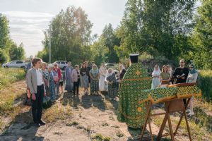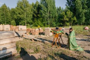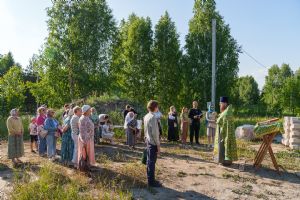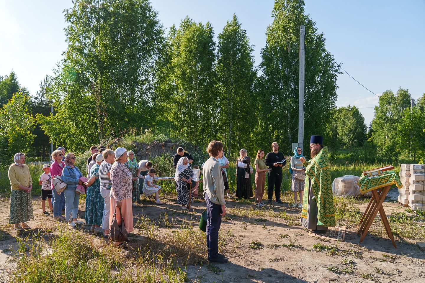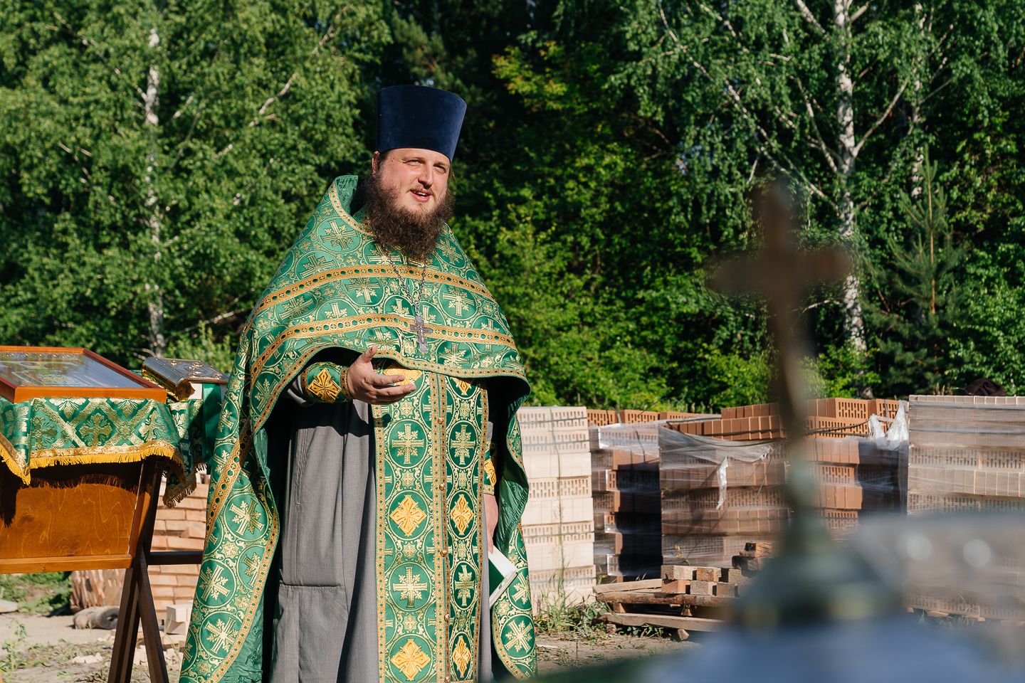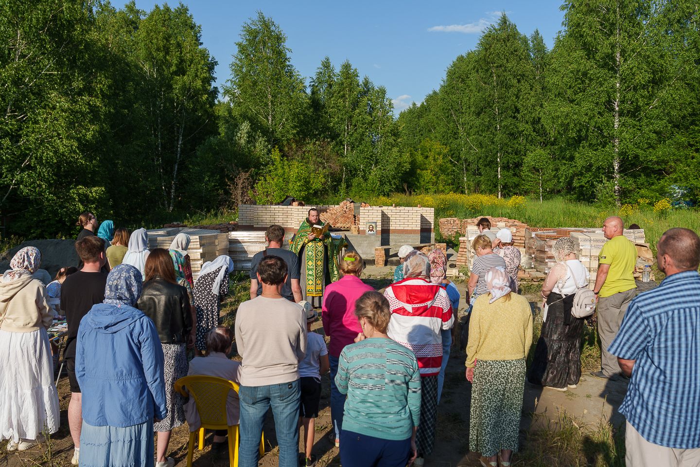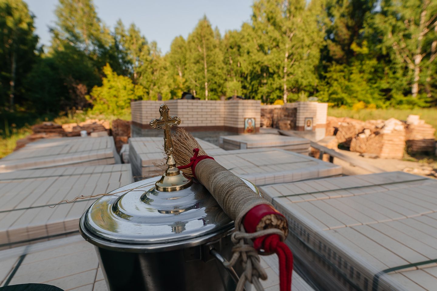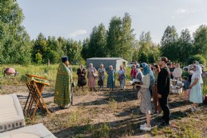 Отец Александр окропил святой водой кирпичи перед дальнейшей работой строителей по возведению стен храмового здания, а также после краткого молебна святым покровителям храма окропил водой каждого присутствующего на молебне молитвенника. Батюшка передал собравшимся слова приветствия от Правящего Архиерея, а также сказал краткую проповедь, призвав неустанно жертвовать на строительство храма и помогать в строительстве любым возможным способом.